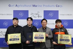 [현대해양] 구리농수산물공사(사장 김진수)는 2024년 최우수 및 우수 중도매인을 선정하고 역대 최대 실적 달성의 주역들을 기리는 현판 증정식을 지난 12일 개최했다.이번 현판 증정식은 지난해 고물가와 내수 침체 등 어려운 경영환경에도 불구하고 1997년 개장 이후 최고 거래금액인 9,390억 원을 달성했다는 점에서 그 의미가 크다.이날 부류별로 선정된 중도매인은 총 9명으로 과일부류 3명[㈜한결청과, 대유청과㈜, 한국청과㈜], 채소부류 3명[대정농산㈜, 일우청과㈜, 윤진농산㈜], 수산부류 3명[㈜참좋은수산, 소영수산㈜, ㈜21세기