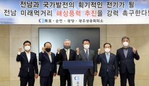 [현대해양] 전남과 광주지역 기업을 대표하는 목포·순천·광양·광주 등 4개 상공회의소의 회장이 한 자리에 모여 22일 미래 신산업이 될 해상풍력 추진에 대한 새정부 국정 반영을 촉구했다.4개 상공회의소 회장은 이날 목포상공회의소 대회의실에서 공동성명서를 통해 “최근 인수위 지역균형발전특위가 ‘해상풍력 신중 검토 의견’을 발표한 데 대해 깊은 유감을 표한다”고 밝혔다.그들은 “해상풍력은 새로운 반세기를 선도할 전남의 미래 먹거리인 동시에, 국가경제의 신성장동력이 될 글로벌 신산업으로 지역에 새로운 희망을 불어넣고 있다”며 “해상풍력은
