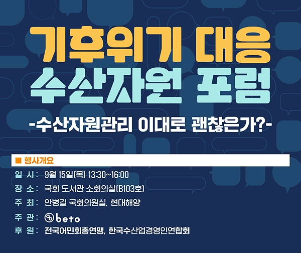 오는 15일 오후 1시 30분부터 수산 전문가, 어업인 등 관계자들이 대거 참석한 가운데 수산자원 관리 이대로 괜찮은가를 주제로 ‘기후위기 대응 수산자원 포럼’이 열린다. ‘기후위기 대응 수산자원 포럼’은 안병길 국회의원실과 현대해양이 주최하고 ㈜베토가 주관한다. 전국어민회총연맹과 한국수산업경영인연합회 등 어업인들이 후원하는 이 포럼에는 국회 농림축산식품해양수산위원회(농해수위) 소속 의원, 해양수산계 인사들이 참석, 축사를 할 예정이다.