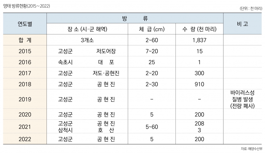 명태 치어를 동해에 방류하기 시작한 것은 프로젝트가 시작된 이듬해인 2015년부터다. 2015년 12월 당시 장관까지 참석해 강원도 고성군에서 자연산란을 통해 얻은 명태 치어 1만 5,000마리(7~20cm)를 처음 방류했다. 그리고 2016년엔 양양군 수산항 해상가두리에 5,000마리를 방류했다. 그리고 2018년 91만 마리를 비롯해 프로젝트 9년차인 올해까지 총 180만여 마리의 명태를 강원도 동해안에 방류했다.