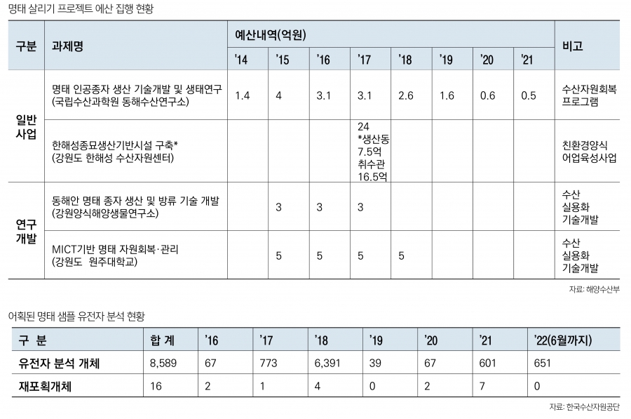 그럼 명태 살리기 프로젝트에 예산은 얼마나 투입됐을까? 해수부가 윤미향 국회의원실에 제출한 자료에 따르면 2014년부터 2021년까지 8년간 동해안 명태 인공종자 생산 기술개발 및 생태연구, 명태 종자 생산 및 방류 기술 개발 등에 무려 69억 9,000만 원이 투입됐다. 여기에 강원도 한해성수산자원센터 명태 종자 대량생산시설 구축비 48억 원 중 국비 50%도 포함된다. 강원도 소속기관인 한해성수산자원센터는 동해 연안 수산자원 증식을 위해 자체 예산(도비)을 확보해 명태, 대문어, 대구, 해삼, 북방대합 등을 생산방류하고 있으며, 이 중 일부예산을 명태 종자 생산방류에 활용했다.