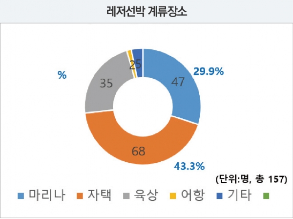 보트 소유자들의 보관 실태를 조사한 결과 자택에 보관한다는 응답이 43.3%로 가장 많았고 마리나에 보관한다는 응답은 29.9%, 그리고 육상에 보관한다는 응답은 22.3%로 나타났다. 육상의 일반 주차장에 보관할 정도의 사이즈라면 17ft(약 5m)급 이하 소형보트로서 트레일러의 길이는 5.3미터, 너비는 2.1m 정도의 크기이다. 즉, 국내 보트 소유자가 구매한 다수의 보트는 럭셔리한 대형보트가 아닌 낚시에 적합한 소형 피싱보트라는 것이다.