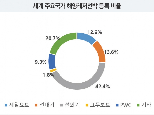 세계 선진 해양레저 주요 국가는 세계해양협회(ICOMIA)를 통해 통계자료를 발표한다. 이들 국가의 해양레저선박 등록비율을 보면 선외기를 장착한 중소형 모터보트가 전체의 42.4%로 가장 많으며 선내기를 장착한 모터보트와 세일요트가 각각 13.6%와 12.2%로 그 뒤를 차지하고 있다. 우리나라는 선외기 모터보트의 비중이 56.1%로 더 높고 세일요트의 비중은 2.8%로 매우 낮은 특성을 갖고 있다. 이는 우리나라 레저보트 시장이 중소형 피싱보트 중심으로 형성되어 있다는 것으로써 국가 계획인 마리나 항만계획도 이러한 특수성을 고려하여 수립되어야 한다.