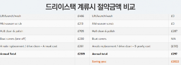 해상 계류장과 드라이스택을 모두 보유한 싱가포르 라플스 마리나(Raffles Marina)의 경우 40ft이하 보트의 해상 계류비는 3년 계약 시 연간 8,616달러(한화 약 843만 원, 1싱가포르달러=979원)이나 28ft보트의 드라이스택 이용 시 3년 계약 기준 연간 6,708달러(한화 약 656만 원)으로 줄게 된다. 여기에 영국 트라팔가 마리나(Trafalgar Marina)의 자료에 따르면 육상 계류가 해상에서 보트가 물에 잠겨 있을 때 보다 보트 관리 유지비용이 연간 약 2,022파운드(한화 333만 원, 1파운드=1,649원) 절약된다고 한다.