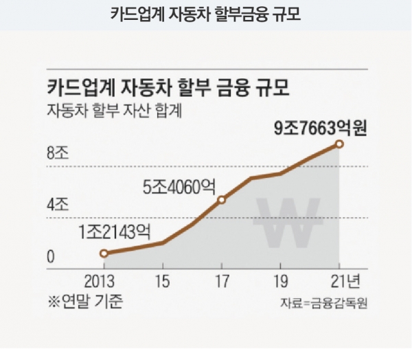 시장이 커지는 만큼 카드사들도 자동차 할부시장에 적극 참여하고 있는데 카드사들의 자동차 할부 대출은 2014년까지만 해도 1조 원 대였지만 2021년에는 10조 원 규모로 커졌다. 자동차 할부는 주로 캐피탈사들이 차지했지만 좀 더 낮은 금리를 제시하는 카드사들이 빠르게 확장한 것이다. 이렇게 차량 구매에 다양한 금융상품이 도입된 결과 목돈이 없어도 고가의 차량을 쉽게 구매할 수 있는 방법이 생기면서 20대와 30대 등 젊은 층의 자동차 구입과 수입차 판매가 크게 늘어났다. 은행, 캐피탈, 카드사, 제2금융권까지 다양한 오토론(자동차 대출상품)이 출시되며 2017년에 이미 30조 원을 넘어섰다.