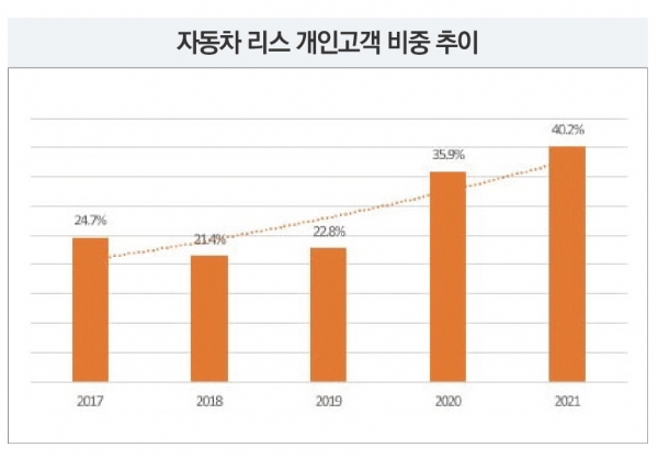 자동차는 소유하는 것이 아니라 이용하는 것이라는 소비자 인식변화와 함께 자동차 리스상품이 크게 확산됐다. 우리나라에 자동차 리스상품이 처음 출시된 2001년에 1,000억 원에 불과했던 국내 시장규모는 2021년 13조 원으로 성장했다. 현대캐피탈의 자동차 리스 개인 고객 비중도 2017년 24%에서 2021년 40%대까지 높아졌다. 구매 부담을 경감시킨다는 점에서 리스와 할부는 같지만, 차이도 있다. 차량을 온전히 소유하기 위해 구매대금을 빌려 매달 갚아 나가는 것이 할부 상품이라면 차량을 일정 기간 이용하기 위해 돈을 내는 것이 리스상품이다.