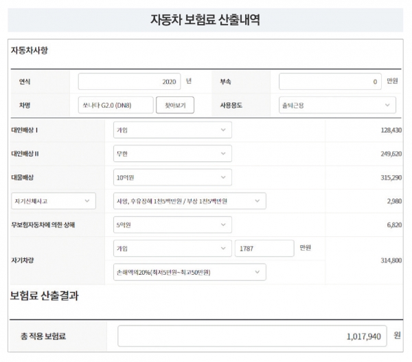 자동차 보험료는 운전자 연령, 차량가액, 사용용도, 사고유무, 피보험자 범위 등 여러 가지 요건에 따라 달라진다. 예로 2020년형 쏘나타 G2.0 모델을 출퇴근용으로 대인배상1과 무한의 대인배상2, 10억 원의 대물배상 등의 보장조건으로 무사고 7년차인 40대 운전자 조건을 기재하면 보험료가 약 101만 원으로 나온다. 물론 다른 조건을 추가하고 변경하면 보험료는 달라지지만 비슷한 조건이라면 일반적으로 내는 보험료의 범주는 100만 원 내외이다.