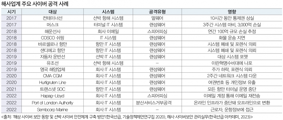 해사 사이버 공격에 있어 2017년 6월 덴마크에 소재한 세계 최대 해운사인 머스크(Maersk)는 랜섬웨어 공격으로 인해 직접적인 매출 감소, 추가 근로, 수습 비용 등이 발생했다. 알려진 손실이 약 3억 달러였다. 2022년까지 공개된 해상 사이버 공격의 유형을 보면, 주로 멀웨어(랜섬웨어)였고, 일부 스피어 피싱, DDos가 있었다.