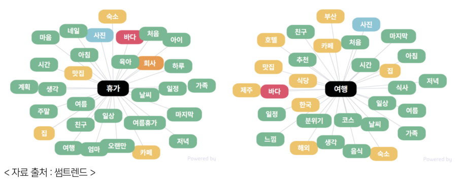 ‘휴가’와 ‘여행’의 연관어 분석 결과를 보면 “휴가란 집, 회사, 일상을 벗어나 바닷가 숙소에 머물며 가족이나 친구와 맛집이나 카페에서 마음을 힐링하고 생각을 정리하는 시간을 가지는 여행”이며 “여행이란 일상을 벗어나 바닷가 맛집이나 카페에서 가족 또는 친구와 맛있는 음식을 먹으며 사진을 찍고 기분을 전환하며 보내는 시간”이다.