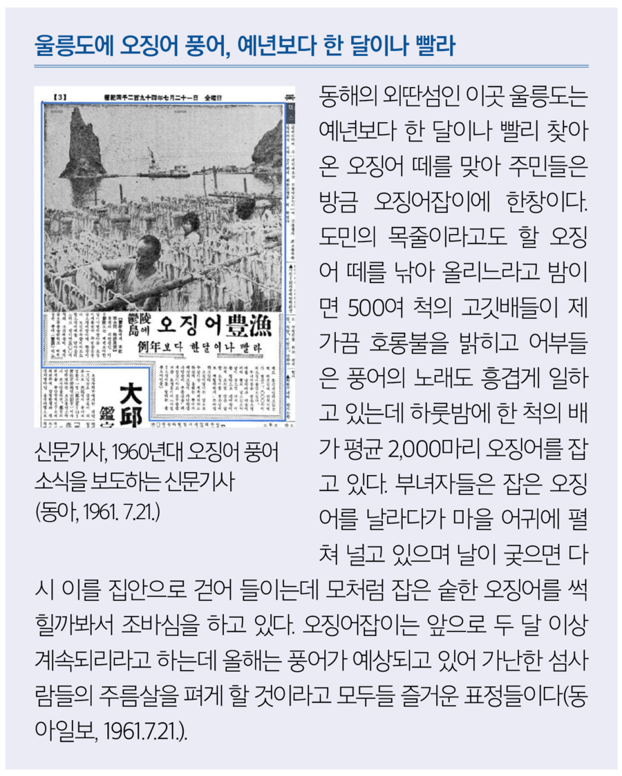 울릉도 오징어잡이 시작은 일제강점기 섬에 거주하는 일본인 어부에 의해 시작되었다. 이후 화전을 이용해 농사를 짓는 것보다 오징어가 소득이 높음을 알고 조선인들이 조업에 나섰다. 해방 후 울릉도 어민들은 꽁치잡이와 오징어잡이가 중심이었다. 저동항을 중심으로 동해안 어업 전진기지가 마련되면서 울릉도 경제는 농업은 자급용, 어업은 상업용으로 전환되기 시작했다. 그리고 오징어잡이 어구도 많은 낚시를 매달은 ‘로라’가 도입되고, 어선도 무동력선 ‘강고배’에서 동력을 갖춘 대형선으로 전환되었다. 1960년대 울릉도는 오징어 호황으로 섬이 들썩였다. 당시 한 신문의 기사 내용이다.