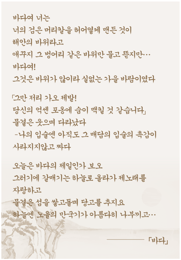 「港口夕景」, 「海岸에서」, 「섬」 등의 작품이 수록되어 있다. 이 중 「바다」, 「港口夕景」을 살펴보고자 한다.