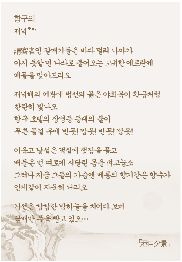 <물결은 웃으며 다라났다>는 표현 역시 단순한 서정을 넘어서는 시적 인식이다. 이어지는 <물결은 섬을 쌓고돌며 당고를 추지요>나 <하늘엔 노을의 만국기가 아름다히 나부끼고…>라는 회화적 수법은 이를 다시금 확인할 수 있는 장면이다. 이러한 그의 시적 특징은 「港口夕景」에서도 이어지고 있다.