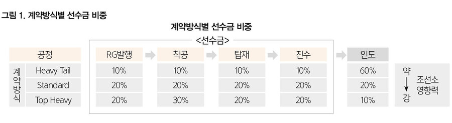 선수금 비율은 조선업 시황과 선박 건조계약 체결 시 계약 당사자의 신용, 협상력에 따라 차이가 발생한다. 자금운영 측면에서는 탑헤비 방식이 조선소에 유리하다.