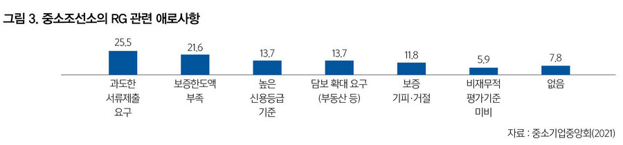 한편 중소기업중앙회가 2021년 6월 중소선박 및 부품, 선박 정비업체 등 조선 산업 관련 제조업 300개 사를 대상으로 실시한 「중소 조선업종 경영실태 조사」에서 RG 발급 관련 애로점에 대해 △과도한 서류 요구(25.5%) △보증한도액 부족(21.6%) △높은 신용등급 기준(13.7%) △담보확대 요구(13.7% △보증 기피·거절(11.8%) 순이었다.