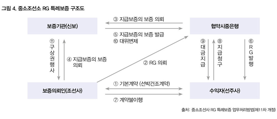 한기원 한국중소조선공업협동조합 전무는 “지난달 5일 금융위원회 주최로 중소조선소 RG 발급 관련 긴급 회의가 열려 업계 상황을 공유했다”며, “조합은 ‘중소조선소에 RG 특례보증(<그림 4> 참조)’이 실제로 적용되는 경우가 드물다고 언급하며, △중소조선산업을 경제성보다 국가경제 기반산업 측면에서 정책적 지원 필요 △수출역량을 갖춘 중소조선소에게 특별 심사기준 적용 필요 △중형조선소와 별도의 중소조선소 위한 RG 특례보증 지원 금액 마련 등을 제안했다”고 밝혔다.