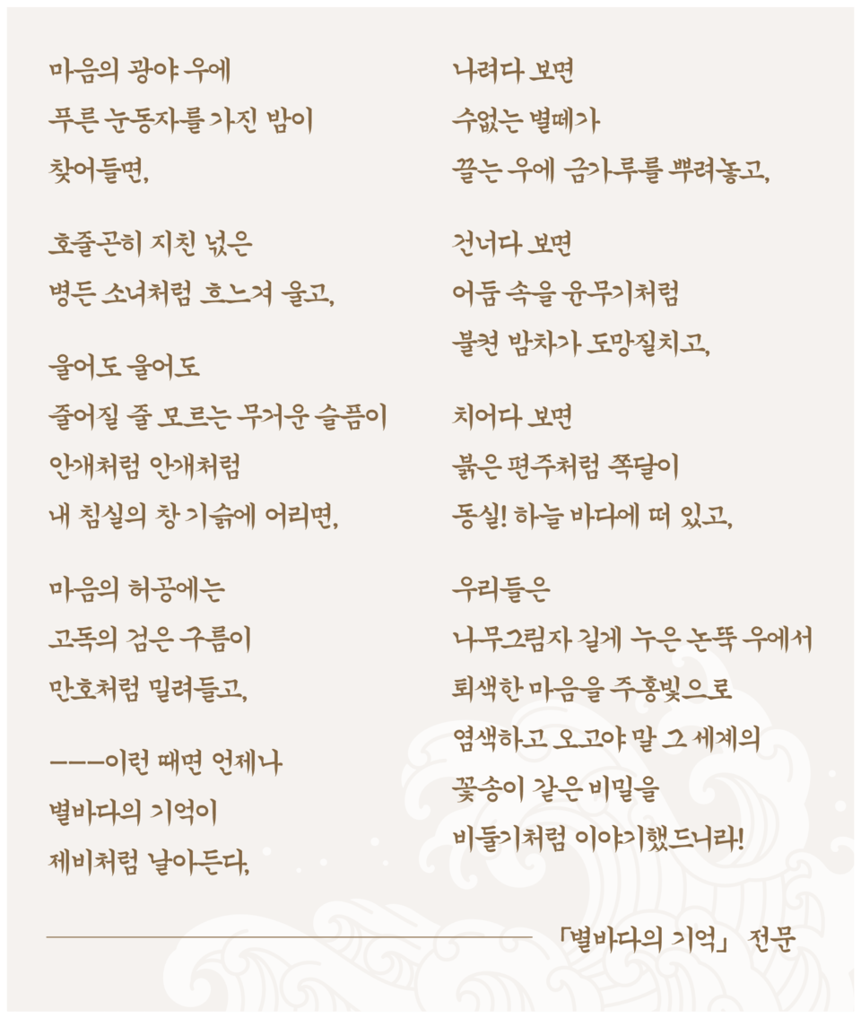 위 시는 현실적인 바다를 노래한 것이 아니라, 천상의 별 바다를 노래하고 있다. 시적 자아는 별바다에 대한 기억을 떠올리기 전에 슬픔을 먼저 토로하고 있다. “울어도 울어도/ 줄어질 줄 모르는 무거운 슬픔”으로 인해 어떻게 해야 할지 몰라 고독의 검은 구름만 만호처럼 밀려들고 있는 지경이다. 즉 무거운 슬픔만을 토로해 보일 뿐이다.