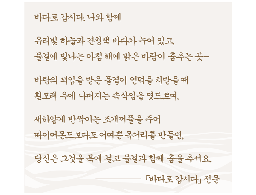 하늘의 별 바다를 노래하던 시인이 이제는 구체적이고 현실적인 바다로 갑시다 라고 외친다. 그 바다에는 앞선 시에서 노래하던 울음과 슬픔의 자취가 사라지고 없다. 바다 물결에 빛나는 아침 해가 세상을 밝히고 있는 곳이고 맑은 바람이 춤추는 곳이다. 바닷바람이 불어 물결이 언덕을 치받기는 해도 흰 모래 위에는 속삭임이 있는 공간으로 바뀌었다. 그리고 이 바다에서 반짝이는 조개꺼풀로 다이아몬드보다도 더 어여쁜 목걸이를 만들고 이것을 목에 걸고 춤을 추라고 권유한다. 자연스러운 바다의 풍광과 그 바다 공간에서 아름다움을 연출하는 한 주체를 떠올리게 된다.