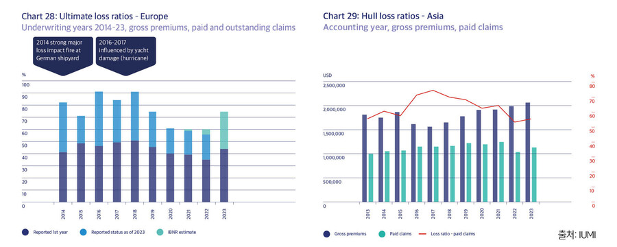 국제해상보험연합(IUMI)의 보고서에 따르면, 2014년부터 2023년까지 10년간 유럽과 아시아 지역의 선체보험 손해율은 손익분기점인 100% 미만을 유지하고 있으며, 최근 4년(2020~2023년) 동안 손해율은 60%대를 넘지 않았다.