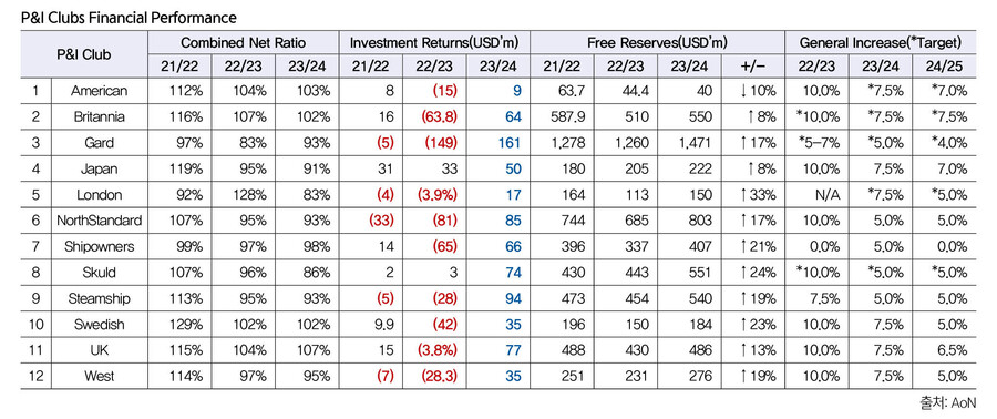 P&I 전문가들은 “국제그룹 P&I 클럽들이 일괄인상 방식을 피하고, 각 클럽의 재정 상태에 따라 개별적으로 보험료를 조정하는 경향으로 바뀌고 있는 것 같다”고 설명했다. 또 다른 P&I 전문가는 “국제그룹 P&I 클럽들의 순합산손해율(CNR: Combined Net Ratio)이 100%미만 또는 그 언저리로 크게 나쁘지 않은 상황에서 올해 투자수익(Investment Return)을 거뒀고, “비상위험준비금(Free Reserve)도 전년대비 증가했다”며 “매년 일괄인상 적용은 회원사에게 거부감을 줄 수 있기에 이를 최소화하는 전략을 취하고 있다”라고 분석했다. 국제그룹 P&I 클럽은 2020년부터 6년째 일괄인상을 해 오고 있다.