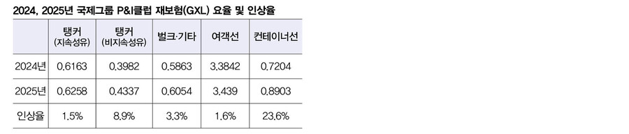 국내 유일한 P&I 클럽인 Korea P&I Club(한국선주상호보험조합)은 2025년에 일괄인상 5%를 밝혔다. 국제그룹 P&I 클럽처럼 별도 재보험료 인상분은 적용되지 않는다.