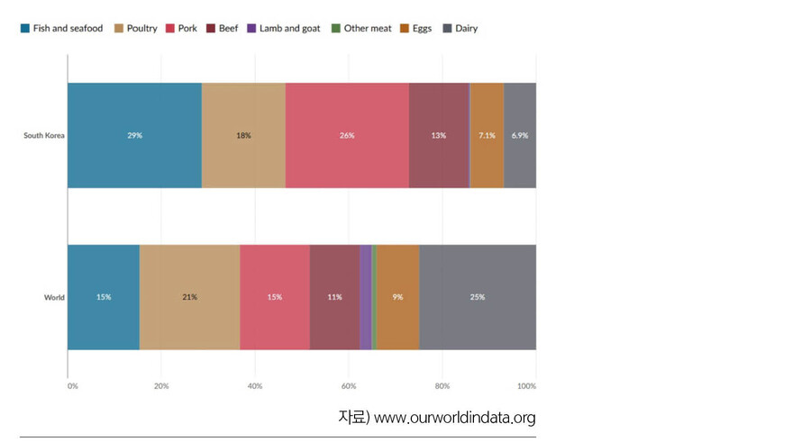 다음 그림은 전 세계와 우리나라에서 소비되는 동물성단백질을 공급원별로 구분한 것이다. 여기서 우리나라 국민들은 세계 평균에 비해 더 많은 비율의 수산물과 돼지고기, 소고기를 더 많이 소비하는 반면, 가금류, 양과 염소, 알, 유제품 소비는 상대적으로 적은 편이다.