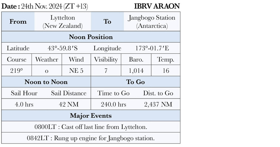 Major Events의 첫 줄은 현지시각 8시에 리틀턴 부두에 묶인 마지막 계류색(Mooring Rope)을 벗긴 것으로, 부두에서 출항한 시점을 의미한다. 두 번째는 현지시각 8시 42분에 장보고 기지로 전속 전진하기 시작했다는 것이다. 마지막 칸의 사진은 전속 전진 후 아침 8시 48분에 선미 갑판에서 촬영한 것으로, 사진 좌우의 섬 사이에 리틀턴 항이 자리하고 있다.