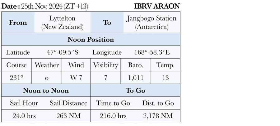 다음 칸의 Noon to Noon은 어제 정오부터 오늘 정오까지의 항해시간, 항해거리를 기록하였고, Time to Go는 목적지인 장보고 기지까지 남은 시간, Distance to Go는 목적지까지 남은 거리를 기록하였다. 여기서 거리의 단위는 해리(海里, Nautical Mile)이다. 아라온 호는 오늘 오전 8시에 출항하였으므로, 정오 기준 항해시간은 4시간, 항해거리는 42해리가 기록된 것이다.