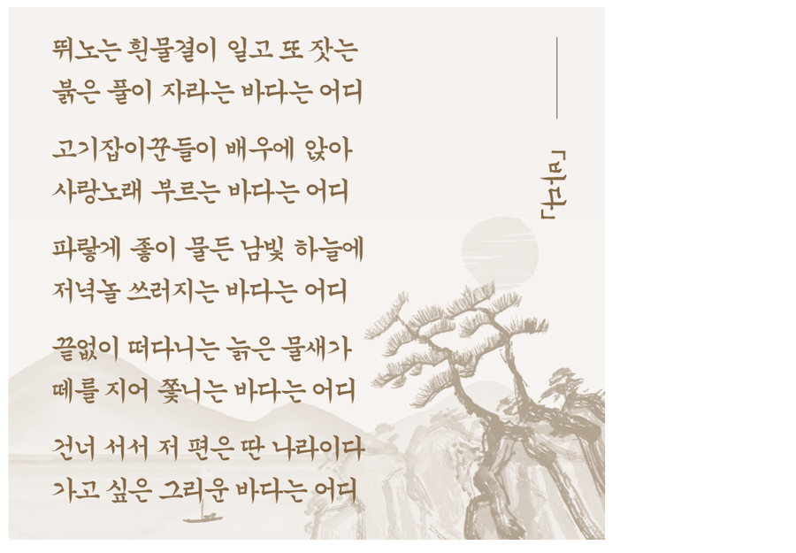 그래서 그가 노래하는 세 번째 연의 바다는 <파랗게 좋이 물든 남빛 하늘에/저녁놀 쓰러지는 바다>로 한 장의 그림처럼 아름답게 채색된 공간으로 이미지화되고 있다. <저녁놀 쓰러지는 바다>의 순간을 포착하고 있음은 바다가 연출하는 가장 아름다운 한 장면을 떠올리고 있기 때문이다. 네 번째 연의 바다는 <끝없이 떠다니는 늙은 물새가/떼를 지어 쫓니는 바다>로 바다 물새에 주목하고 있다. 그리고 마지막 다섯째 연에서는 <건너 서서 저 편은 딴 나라이다/가고 싶은 그리운 바다>라고 맺음을 하고 있다.