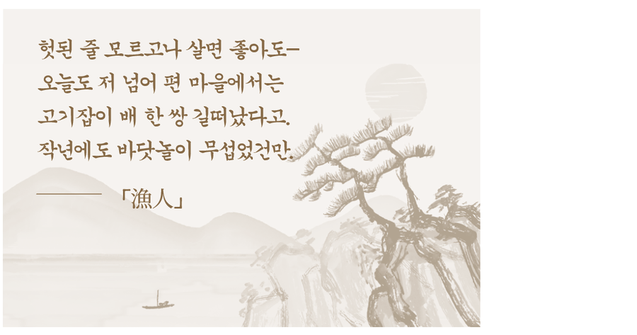 바다를 삶의 터전으로 삼고 사는 어부들은 파도가 있고 위험이 있는 바다를 향해 언제나 나아가야 한다. 그래서 시인은 <오늘도 저 넘어 편 마을에서는/고기잡이 배 한 쌍 길떠났다고> 노래한다.