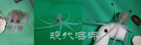 인공 종자로 부화한 대문어는 부화 직후 체장 1cm, 체중 0.04g에서 성장해 100일째에는 3.2cm/0.45g, 200일째에는 4.5cm/1.3g, 342일째에는 8.3cm/4.5g에 도달했다.