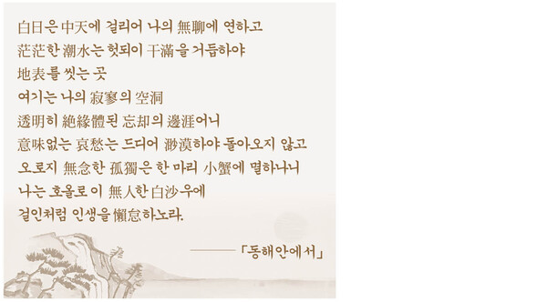 이 시에서 나타나는 분위기는 바다가 내보이는 역동성이나 생명력을 찾아보기는 힘들다. <白日은 中天에 걸리어 나의 無聊에 연하고/茫茫한 潮水는 헛되이 干滿을 거듭하야 地表를 씻는 곳>으로 묘사되고 있다. <무료>와 <헛되이>라는 두 시어에서 시인의 마음의 상태를 읽어낼 수 있다. 한 마디로 외롭고 공허함이다. 동해안 바닷가에서 시인은 <寂寥의 空洞> 속에 놓여 있는 상태이다. 동해 바다에 대한 새로운 인식이나 이미지는 없다. 단지 <호올로 이 無人한 白沙우에>에서 <걸인처럼 인생을 懶怠하>고 있을 뿐이다. 현실로부터 쫓겨나 <오로지 無念한 孤獨>의 주체가 되어 있다. 떠돌아다닐 수밖에 없는 시인의 삶의 현실이 여실히 드러나고 있다. 이러한 시인의 마음 상태는 「秋海」에서 그대로 이어지고 있다.