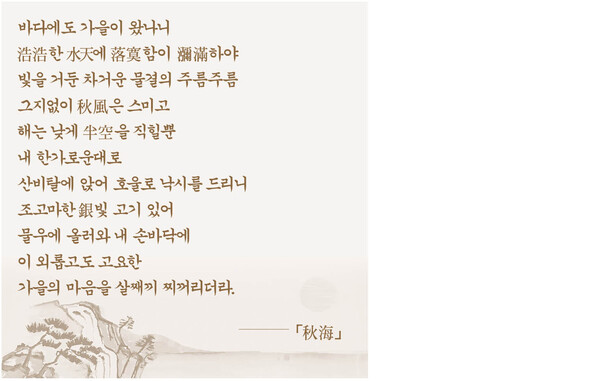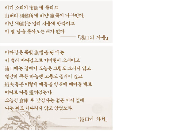 가을 바다의 분위기도 <浩浩한 水天에 落寞함이 瀰滿하>여 쓸쓸함이 짙게 묻어난다. 뿐만 아니라 <빛을 거둔 차거운 물결의 주름주름/그지없이 秋風은 스미고/해는 낮게 半空을 직힐뿐>이다. <호울로 낙시를 드리>우고 <조고마한 銀빛 고기 있어/물우에 올러와 내 손바닥에/이 외롭고도 고요한/가을의 마음을 살째끼 찌꺼리>는 고독한 시적 분위기만 전달하고 있다. 「港口의 가을」과 「港口에 와서」도 이러한 방랑자의 고독함을 항구에 있어야 할 배의 부재와 어부들의 부재를 통해 드러내고 있다.