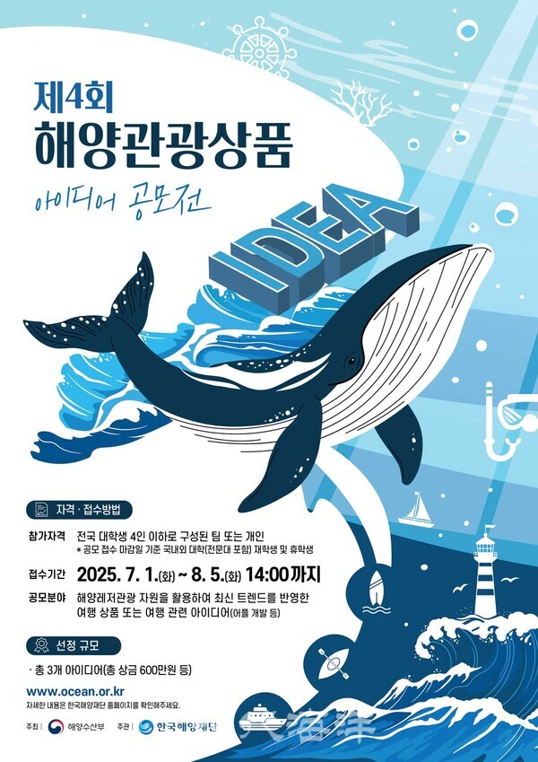 [현대해양] (재)한국해양재단(이사장 문해남)은 대학생의 창의적인 해양레저관광 아이디어 발굴을 지원하기 위해 이달 1일 부터 다음달 5일까지 ‘해양관광상품 아이디어 공모전’을 개최한다고 밝혔다.