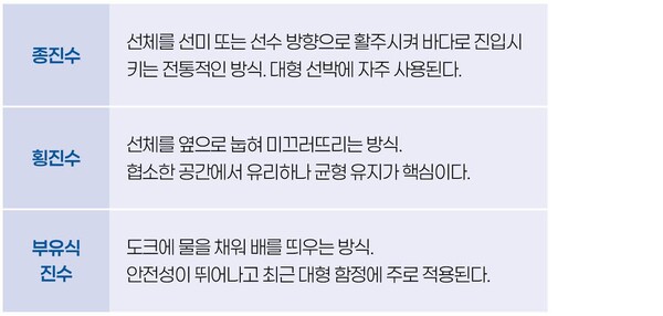 진수는 선박 건조 완료 후 처음으로 물에 띄우는 과정이다. 이 작업은 선체 무게가 수천 톤에 달하는 만큼 고도의 공학 기술과 안전 관리를 필요로 하며, 대표적으로 아래와 같은 방식이 있다.
