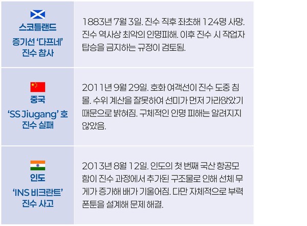 남종호 한국해양대학교 조선해양시스템공학부 교수는 “횡진수는 구조적으로 부력과 복원력의 미세한 균형을 요구하기 때문에, 진수 각도나 속도, 균형 제어에 실패하면 선체가 한 방향으로 기울 수 있다”며 “횡진수는 종진수보다 위험도가 높아 국내 대형 조선소에서는 거의 사용되지 않는다”고 설명했다.