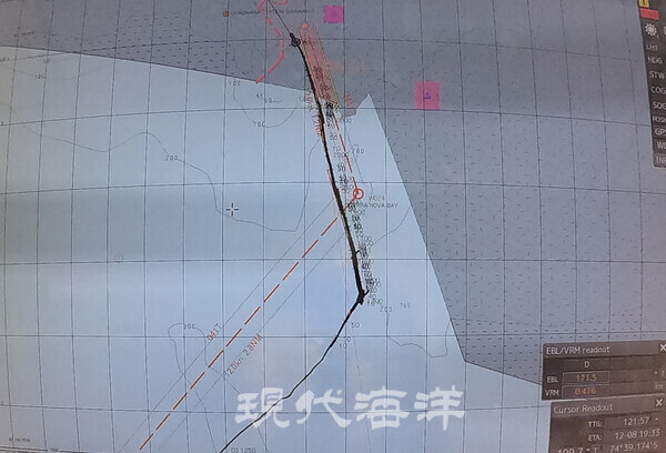아침 식사 중에 선원들끼리 이야기하는 소리가 들려왔다. 어젯밤처럼 많은 횟수의 Ramming 작업을 처음 겪어 본다고. 내가 좋은 경험을 했다고 하기가 조심스럽다. 때로는 한 장의 사진이 모든 것을 설명하기도 한다. 179회의 Ramming이 고스란히 담겨진 ECDIS(전자해도표시정보시스템) 화면을 촬영했다. 아래사진에서 북동 방향으로 올라오다가 북쪽으로 꺾인 이후, 짙어진 검고 굵은 선이 전진과 후진을 반복해 항적이 겹쳐진 곳이다.
