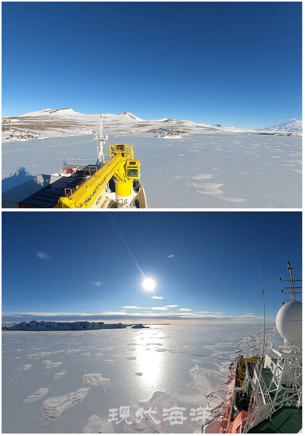 지난밤 아라온호의 외로운 사투 덕분에 남극의 땅과 장보고 기지가 부쩍 가까이 다가왔다. 걸어서 갈 수 있다. 바다를 걸어서 건널 것이란 말이다. 사진 가운데 파란 건물이 장보고 기지다.