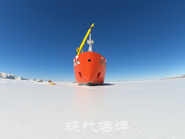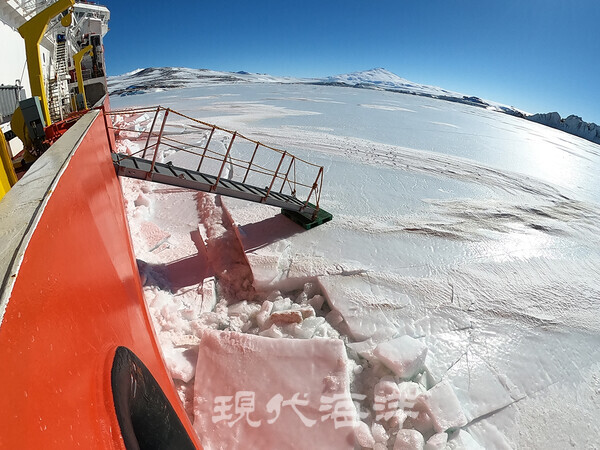 장보고 기지로 가는 연구자들은 오후 1시 30분 하선 예정이다. 지금은 오후 12시 30분. 딱히 할 일이 없어 어슬렁거린다. 선미 갑판에 나가 보니, 이미 아라온호를 오르내리기 위한 갱웨이(Gangway, 승하선용 사다리)가 빙판 위에 설치되어 있다. 뭔가 불안해 보여도 빙판이 두꺼워 안전하다고 한다. 아라온호 역시 양쪽의 얼음으로부터 밀려 붙어 움직임 없이 머물러 있다.
