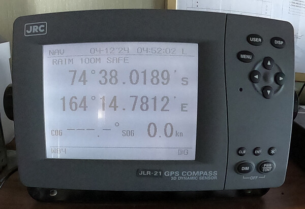 여섯 시를 조금 넘겨 브리지에 올라갔다. 아무도 없고 Ice Pilot 홀로 항해일지를 정리 중이다. 조금 전 여섯 시에 최종 목적지 앞에 도착했다고 한다. 내가 샤워 중에는 아라온호의 자세(기울기)를 바로 잡기 위한 Ramming을 한 것이라 한다. 아무 의미 없겠지만, 총 몇 번의 Ramming이었는지 궁금했다. 기록상으로는 17시간 동안 179번의 Ramming을 시도해 3km 전진.
