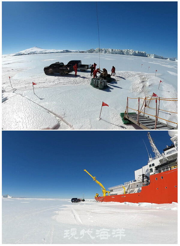 오후 1시 30분. 출항 전부터 약 2주간 아주 쬐끔(?) 정들었던 연구자들이 하선하기 시작했다. 높은 확률로 빈말이 되어 버리겠지만 목포에 오면 민어회를 사주겠다며 배웅했다. 장보고 기지로부터 온 코란도 픽업과 포터에 짐을 싣고 차례로 떠나갔다. 다음 차는 코란도로 사야겠다. 사진의 빨간 깃발은 아라온호가 부수어 놓은 얼음과 자연적인 크랙으로 접근하지 말라는 표시이다.