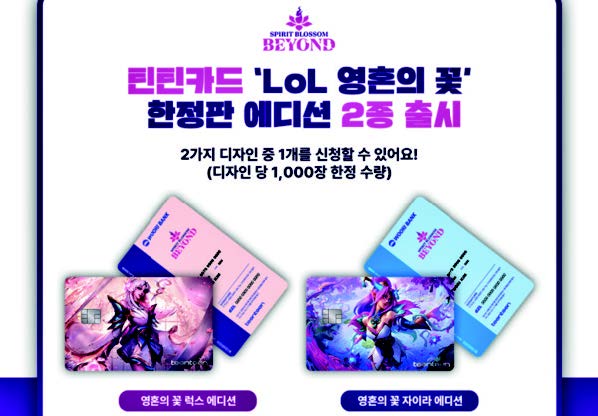 [현대해양] 우리은행은 라이엇 게임즈의 인기 게임 ‘리그 오브 레전드’와 협력해 틴틴카드 ‘영혼의 꽃 에디션’을 출시했다고 지난달 19일 밝혔다. 우리은행은 LCK(리그 오브 레전드 챔피언스 코리아) 메인 파트너사로, 이번 카드 출시를 기념해 9월 14일까지 특별 이벤트를 진행하며, 리그 오브 레전드의 인기 캐릭터 '럭스'와 '자이라'의 일러스트를 적용한 2가지 디자인으로 출시된다.