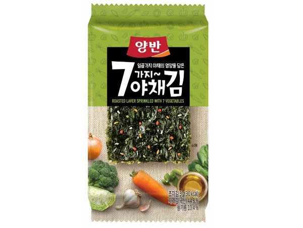 특히 이 제품은 양파, 당근, 시금치, 브로콜리, 양배추, 파, 마늘 등 7가지 야채를 후레이크 형태로 갈아 원물 그대로 김 위에 뿌려 바삭하게 구워냈으며, 엄선한 야채에 열풍 건조 공법을 적용해 본연의 맛과 영양을 유지했다.
