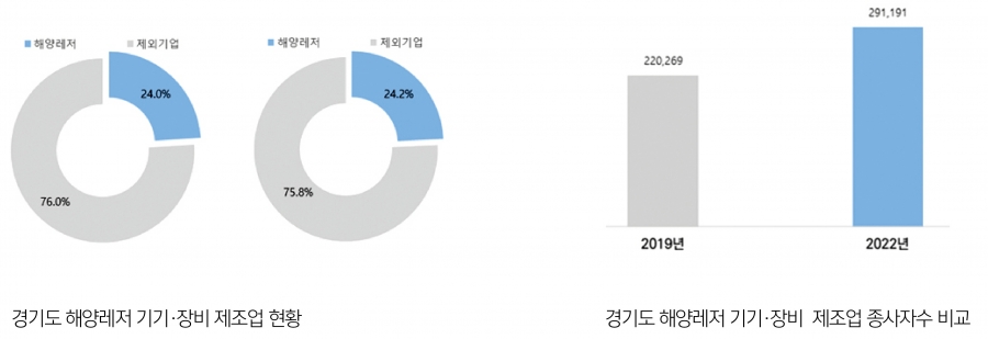 이렇게 분류한 해양레저산업의 분류체계를 2022년도 경기도 공장리스트 데이터베이스를 대입하여 분석하면 경기도 해양레저 기기·장비 제조업 기업체 수는 약 1만 7,000개로 전체의 약 24%를 차지하는 것으로 나타난다. 종사자수도 약 29만명으로 약 24.2%를 차지 하는 것으로 나타났다. 2019년의 데이터베이스와 비교해보면 사업체 수는 1만 2,980개사에서 2022년 1만 7,301개사로 4,321개사, 약 33%가 증가하였으며, 종사자 수도 2019년 22만 269명에서 2022년 29만 1,191명으로 약 7만 명 이상 증가한 것으로 나타났다.