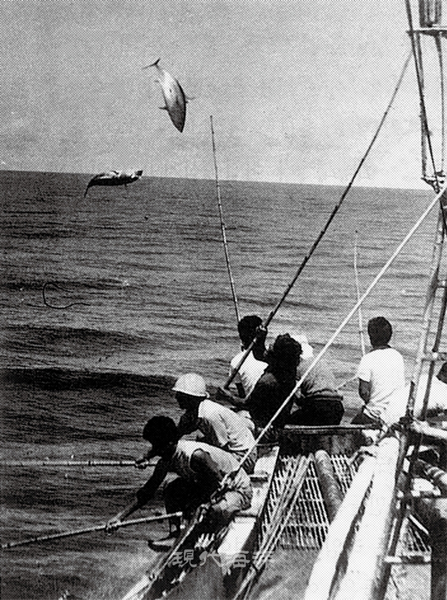 남선장의 명령에 따라 우리 배는 대양의 물결을 가르고 앞으로 힘차게 항진했다. 선미에선 오레김호가 항적을 표시할 양으로 흰 포말(泡沫)을 연신 뿜어댔다. 그러나 그 포말은 오래가지 못한 채 흔적도 없이 사라져갔다. 우리 배가 최고속력으로 달릴 때 어느 틈에 유목을 보았는지 일본어선이 나타났나 했더니 또 다른 한쪽에선 같은 한국어선인 게림디오호(38t)가 숨차게 달려오는 것이었다. 유목을 향해 세 척의 어선은 전쟁을 치르 듯 마구 달렸다. 40분쯤 지났을까? 어선 세 척이 거의 동시에 유목 500m 가까이에 다다르자 선원들은 미리 준비해 온 활멸치를 살수(撒水)와 함께 뿌리기 시작했다. 그제서야 수심 200m 물밑에 있던 가다랑어가 멸치 냄새를 맡고 거의 수면 위로 올라와 던져준 활멸치를 잡아먹기 위해 분주히 돌아다니는 것을 확인할 수 있었다.
